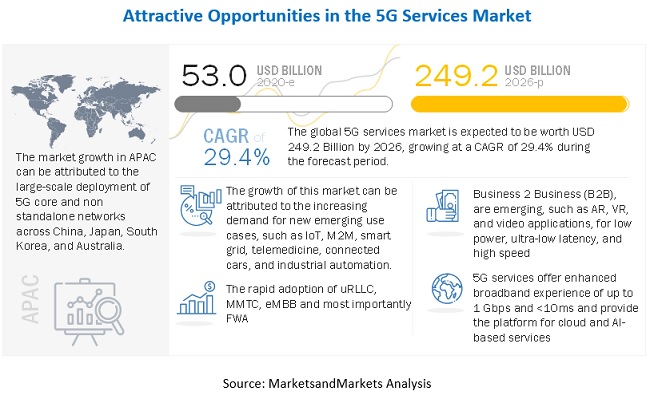 According to new market research report on “5G Services Market by End User (Consumers and Enterprises), Enterprise (Manufacturing, Media and Entertainment, Transportation and Logistics, Government), Application, Communication Type (eMBB, MMTC, URLLC, and FWA), and Region – Global Forecast to 2026″, published by MarketsandMarkets™, the 5G Services Marketsize is expected to grow from USD 53.0 billion in 2020 to USD 249.2 billion by 2026, at a Compound Annual Growth Rate (CAGR) of 29.4% during the forecast period.