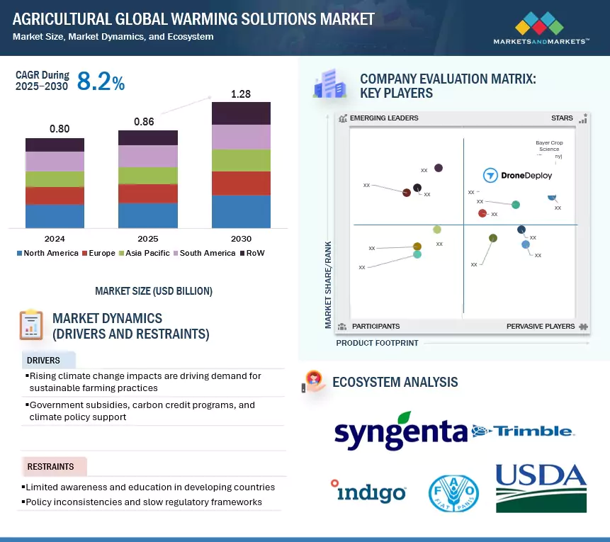 The global agricultural global warming solutions market is projected to grow from USD 0.86 billion in 2025 to USD 1.28 billion by 2030, at a CAGR of 8.2% over the forecast period. This growth is driven by increasing concerns over climate change, food security, and the need for sustainable farming practices. Technological innovations—such as precision farming, AI-driven crop monitoring, and water-efficient irrigation systems—are enhancing agricultural efficiency. Rising demand for organic and sustainable produce is also motivating farmers to adopt eco-friendly approaches. Furthermore, corporate commitments to carbon neutrality and investments in renewable energy for agriculture are fueling market expansion. Climate-induced challenges, including droughts and soil degradation, are creating an urgent need for these solutions worldwide.