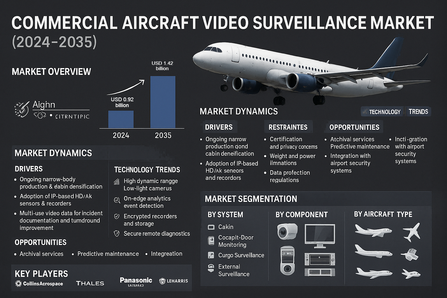 The Commercial Aircraft Video Surveillance Market has matured from a simple deterrence layer into an integrated operational, safety, and evidentiary capability that airlines and OEMs treat as an essential shipset. Valued at an estimated USD 0.92 billion in 2024, the market is forecast to reach approximately USD 1.42 billion by 2035, registering a CAGR of 4.1%. Growth is anchored in ongoing narrow body production and cabin densification, rising adoption of IP based HD/4K sensors and recorders, and a strategic shift toward multi use video data for incident reconstruction, crew training, turnaround optimization, and cargo risk management. This long form analysis explores market segmentation by system, component and aircraft type, regional dynamics, technology trends, certification and privacy implications, aftermarket economics, and the competitive landscape. Throughout the narrative the operational intersections with adjacent security markets notably the Drone Detection Market are highlighted because integration with airport and ground security systems increasingly influences specification, network architecture and the value proposition of airborne video systems.