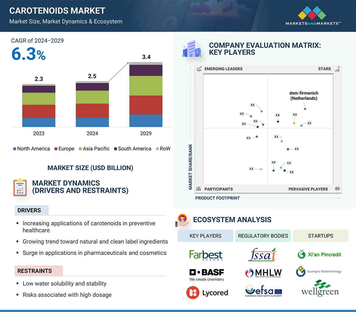 The global carotenoids market is on an impressive upward trajectory. Valued at USD 2.5 billion in 2024, the market is projected to reach USD 3.4 billion by 2029, growing at a CAGR of 6.3%. This surge is fueled by rising consumer demand for natural, nutrition-rich ingredients and expanding applications across food, beverage, cosmetics, and animal feed industries.