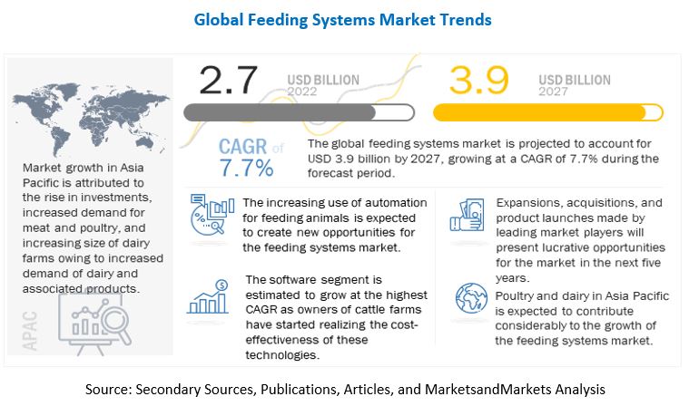The global feeding systems market is projected to reach USD 3.9 billion by 2027, recording a CAGR of 7.7% during the forecast period. It is estimated to be valued at USD 2.7 billion in 2022. A feeding system allows a large number of animals to be fed in a short time so that each animal gets its portion of the allotted feed. The goal is for each animal to have an equal opportunity to eat an equal amount of feed simultaneously. A feeding system allows a large number of animals to be fed in a short time so that each animal gets its portion of the allotted feed. The goal is for each animal to have an equal opportunity to eat an equal amount of feed simultaneously.