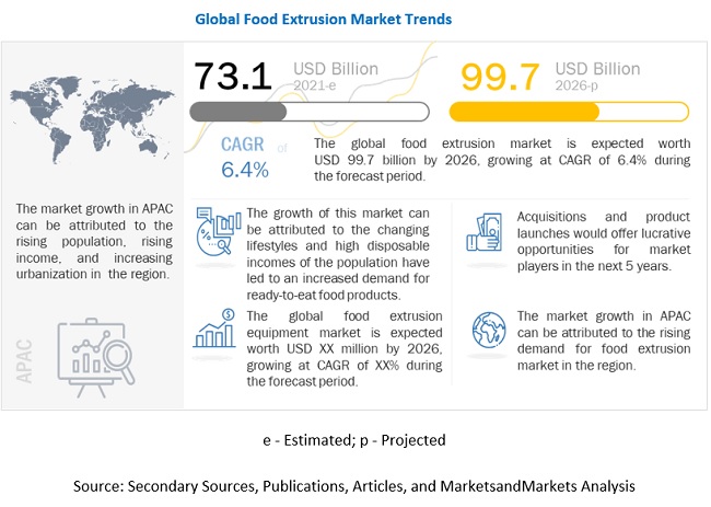 The global food extrusion market is estimated to be valued at USD 73.1 billion in 2021. It is projected to reach USD 99.7 billion by 2026, recording a CAGR of 6.4% during the forecast period. The demand for Ready-To-Eat (RTE) snack foods is growing due to their convenience, nutritional value, attractive appearance, taste, and texture. Cereal-based extruded snacks are the most commonly consumed type of snack. Extruders blend diverse ingredients to develop novel snack foods. The quality of the final product depends on the processing conditions used during extrusion, which include the composition of raw materials, feed moisture, barrel temperature, screw speed, and screw configuration.