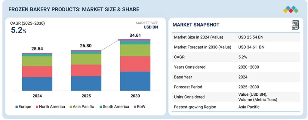 The global frozen bakery products market is projected to grow from USD 26.80 billion in 2025 to USD 34.61 billion by 2030, registering a Compound Annual Growth Rate (CAGR) of 5.2% during the forecast period. The market is experiencing steady expansion as manufacturers advance freezing technologies to preserve freshness, extend shelf life, and deliver high-quality, convenient bakery solutions. Frozen bakery products encompass a wide range of formats, including breads, pizza crusts, cakes, pastries, and other bakery items, available across ready-to-proof, ready-to-bake, and ready-to-eat categories.