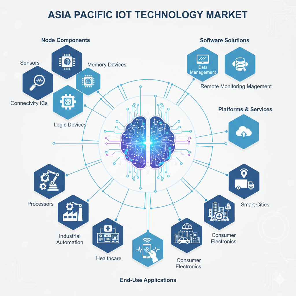 The Asia Pacific IoT Technology Market encompasses the production, deployment, and management of IoT devices, software solutions, platforms, and services across industries in Asia Pacific. It includes node components like sensors, processors, memory devices, connectivity ICs, and logic devices, as well as software solutions and platforms that enable real-time monitoring and data-driven decision-making.