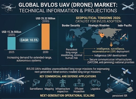 The global BVLOS UAV (Drone) Market is witnessing strong growth as organizations invest in technologies that extend drone operational range and autonomy. The market is expected to reach USD 25.32 billion by 2030 from USD 15.36 billion in 2025, growing at a CAGR of 10.5%.