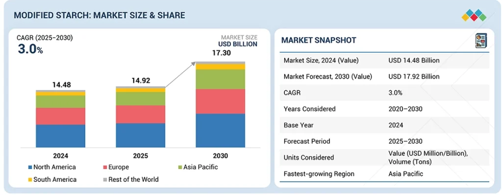 The modified starch market is estimated at USD 14.92 billion in 2025 and is projected to reach USD 17.30 billion by 2030, at a CAGR of 3.0%. The global modified starch market is expanding rapidly as food manufacturers increasingly prioritize product stability, texture enhancement, and clean-label functionality across processed and convenience foods. Growing consumer demand for healthier, high-quality, and easy-to-use food products, as well as rising awareness of ingredient transparency, is driving strong adoption of modified starches in a wide range of applications. The shift toward functional, science-backed ingredients that improve viscosity, binding, freeze–thaw stability, and overall product performance is a significant factor accelerating market growth.