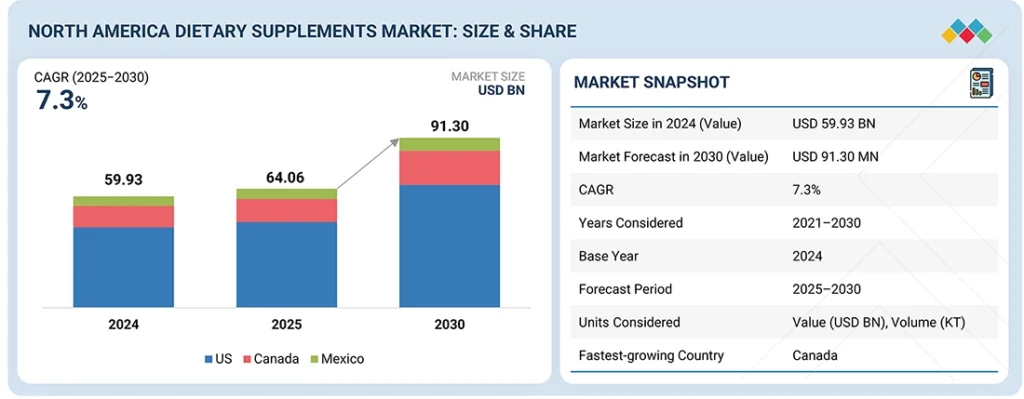 According to MarketsandMarkets™, The North America dietary supplements market is poised for strong growth, projected to expand from USD 64.06 billion in 2025 to USD 91.30 billion by 2030, registering a compound annual growth rate (CAGR) of 7.3% during the forecast period. Market expansion is primarily fueled by the rising adoption of preventive health and wellness practices, growing demand for plant-based and clean-label supplements, and the continued rise of sports nutrition and lifestyle fitness trends.