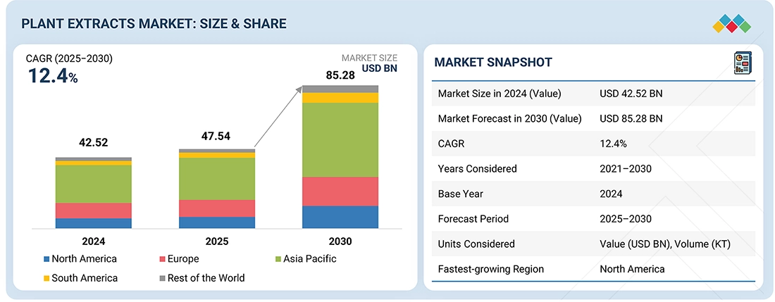 The plant extracts market is estimated at USD 47.54 billion in 2025 and is projected to reach USD 85.28 billion by 2030, at a CAGR of 12.4% from 2025 to 2030. Demand for plant extracts is expected to rise strongly in the coming years as consumers increasingly shift toward natural, clean-label, and botanical ingredients for health, wellness, and safe nutrition. With growing awareness of the limitations and side effects associated with synthetic additives, plant-derived extracts rich in polyphenols, flavonoids, essential oils, alkaloids, carotenoids, and other bioactive compounds are gaining significant attention for their proven antioxidant, anti-inflammatory, antimicrobial, immune-supporting, and therapeutic properties. Their stability under varied processing conditions enables broad integration into functional foods, dietary supplements, beverages, cosmetics, and personal care formulations. Popular extracts such as turmeric, ashwagandha, green tea, aloe vera, rosemary, chamomile, and ginseng are increasingly recognized for promoting digestive health, stress relief, cognitive balance, skin vitality, and immune resilience. As the global population becomes more health-conscious and prioritizes natural, preventive, and plant-based solutions, consumer demand for botanical extracts is expected to accelerate significantly, positioning them as a core component of the evolving natural wellness and clean-label ingredients market.