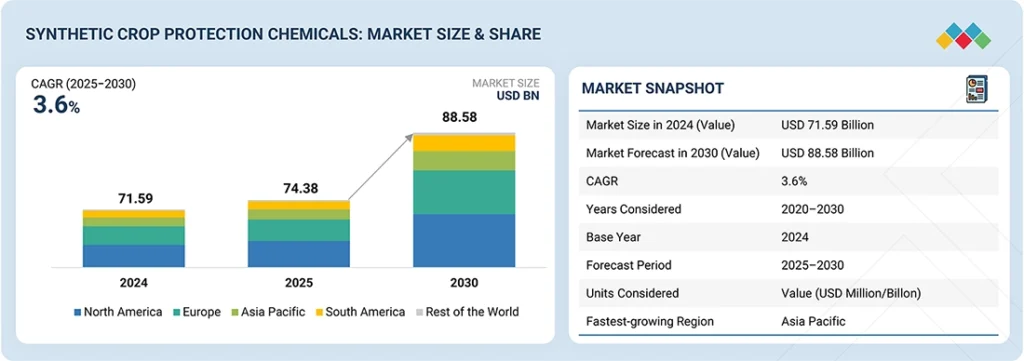 According to MarketsandMarkets™, the global synthetic crop protection chemicals market is projected to grow from USD 74.38 billion in 2025 to USD 88.58 billion by 2030, registering a compound annual growth rate (CAGR) of 3.6% during the forecast period. The market encompasses chemically synthesized herbicides, insecticides, and fungicides that play a critical role in controlling weeds, pests, and diseases across major agricultural crops.