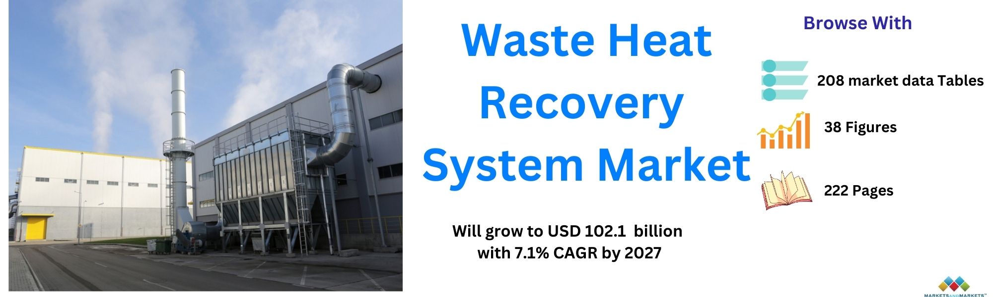 The report Waste Heat Recovery System Market by Application (Preheating and Steam & Electricity Generation), End-Use Industry (Petroleum Refining, Metal Production, Cement, Chemicals, Pulp & Paper), and Region – Global Forecast to 2027″, size is expected to grow from USD 72.5 billion in 2022 to USD 102.1 billion by 2027 at a compound annual growth rate (CAGR) of 7.1% during the forecast period. The main factor driving the WHRS market during the forecast period includes the government regulations, awareness towards fighting climate change and global warming. Also, increase in interests related to energy efficient options and related technology across the globe is providing momentum to the growth of the market.