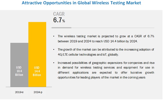 The global wireless testing market size was valued at USD 10.4 billion in 2019 and is projected to reach USD 14.4 billion by 2024; it is expected to grow at a CAGR of 6.7% during the forecast period. The adoption of advanced manufacturing techniques that require minimum human intervention and maintain quality of products has been increasing across different industry verticals. Recent advancements in wireless technologies such as 4G and 5G have increased the scope for wireless testing in a wide range of applications in the industrial and commercial sectors. Also, increased demand for low power consumption devices used to carry out machine-to-machine communication of devices fuel the demand for wireless devices. This, in turn, contributes to the growth wireless testing market, globally.