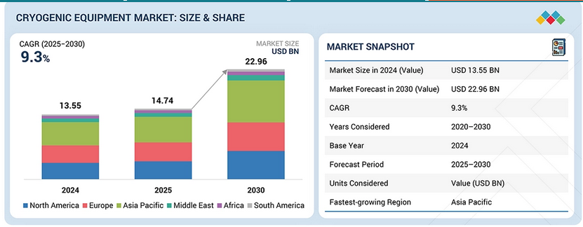 The report “Cryogenic Equipment Market by Equipment (Tanks, Valves, Vaporizers, Pumps), Cryogen (Nitrogen, Argon, Oxygen, LNG, Hydrogen), End-user Industry (Energy & Power, Chemical, Metallurgy, Transportation), System Type, Application, & Region – Forecast to 2030” is projected to grow from USD 13.55 billion in 2024 and to reach USD 22.96 billion by 2030, at a Compound Annual Growth Rate (CAGR) of 9.3% during the forecast period.