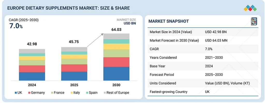 According to MarketsandMarkets™, The Europe dietary supplements market is estimated to be valued at USD 45.75 billion in 2025 and is projected to reach USD 64.03 billion by 2030, growing at a compound annual growth rate (CAGR) of 7.0% during the forecast period. The market is witnessing consistent expansion, supported by a strong preventive healthcare culture and increasing consumer focus on long-term wellness across the region.