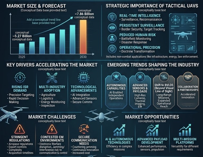 The Tactical UAV (Drone) Market demonstrates strong and steady growth potential, driven by increasing defense budgets and technological innovation. The market is projected to reach USD 7.86 billion by 2030, up from USD 5.27 billion in 2025, reflecting a CAGR of 8.3%.