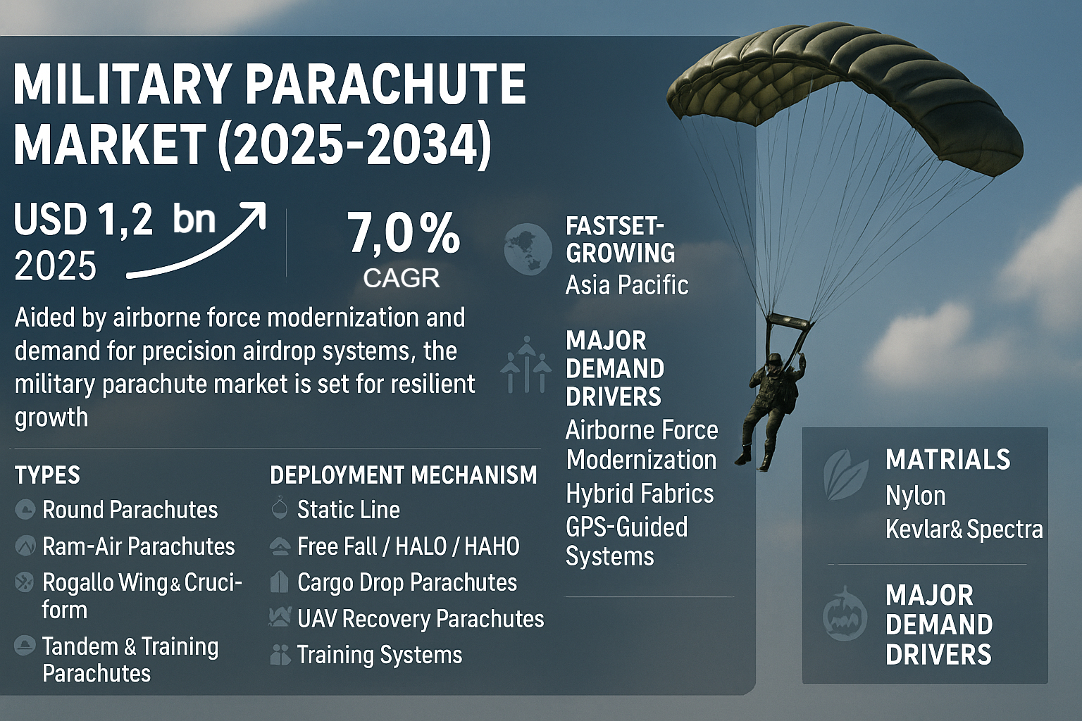 The Military Parachute Market is entering a decade of accelerated transformation as armed forces modernize airborne brigades, expand special operations capabilities, and push for more precise, survivable airdrop solutions. Valued at around USD 1.2 billion in 2025 and projected to reach approximately USD 2.4 billion by 2034, the Military Parachute Market is expected to grow at close to a CAGR of ~7.0%. This growth reflects a shift from legacy round canopies to agile ram air systems, from simple fabric-and-lines to intelligent, sensor enabled platforms that can support complex operational concepts such as high altitude, long range infiltration and autonomous cargo resupply.