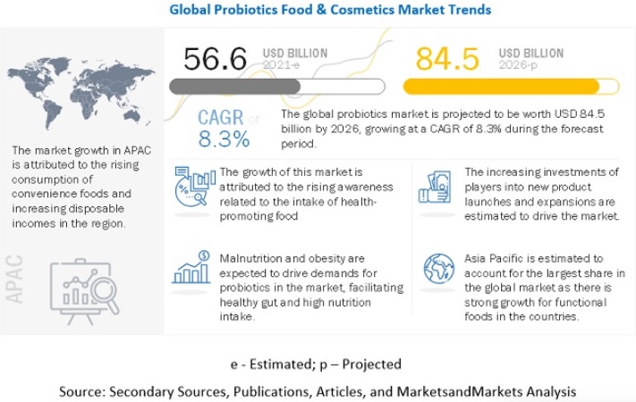 The probiotics food & cosmetics market is projected to reach from USD 56.6 billion in 2021 to USD 84.5 billion by 2026, at a CAGR of 8.3% from 2021 to 2026. The global perception toward daily food products is shifting from products providing basic nutrition to those offering several health benefits, such as functional foods. Today, a wide range of functional foods have been developed, including probiotics, prebiotics, and symbiotic foods. These products have changed the approach of various food processors from considering food only as a source of energy and nutrition to biologically active food components that confer benefits on human health.