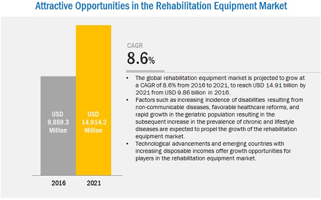 The growth of this industry is mainly driven by factors such as growing incidence of disabilities resulting from non-communicable diseases, favorable healthcare reforms, and rapid growth in the geriatric population coupled with the rising prevalence of chronic diseases. However, a high cost & maintenance expense of rehabilitation equipment is the key factor that is expected to restrain the growth of this market to a certain extent.