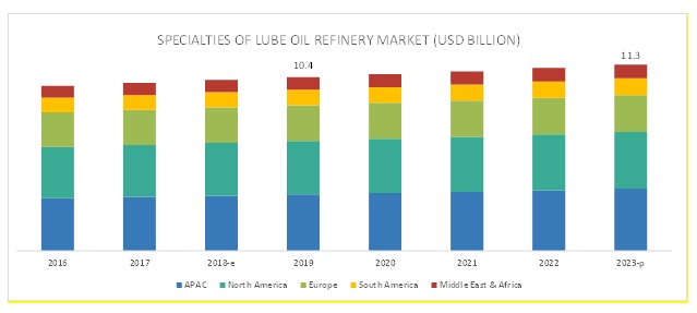 Specialties of lube oil refinery are the derivatives of lube oil refining consisting of a mixture of hydrocarbon molecules. Paraffin wax, microcrystalline wax, slack wax, anti-ozone wax, and process oils are the products obtained in the process of lube oil distillation. The global specialties of lube oil refinery market size are estimated to grow from USD 10.4 billion in 2018 to USD 11.3 billion by 2023, at a CAGR of 1.8%. The high demand for specialties of lube oil refinery from the packaging, pharmaceutical, and cosmetics industries is driving the market. However, regulations to limit the use of petroleum-derived products in cosmetics manufacturing and increasing demand for synthetic and bio-based waxes are major challenges in the specialties of lube oil refinery market.